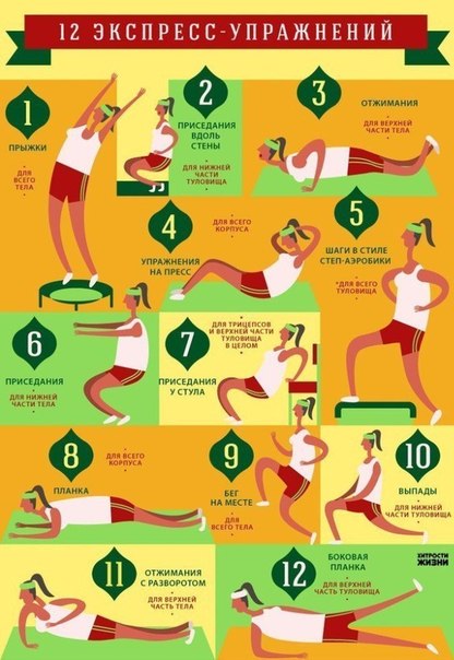 Добиться идеальных форм поможет комплекс из 12 упражнений, в основе которого — краткость и интенсивность. На каждое упражнение нужно тратить не более 60 секунд, и, таким образом, на выполнение всего комплекса уйдёт около 7 минут.