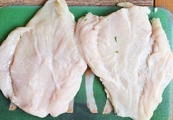 Филе куриной грудки без кожи распластать и слегка отбить до толщины 0,5 сантиметра. Посолить и поперчить.