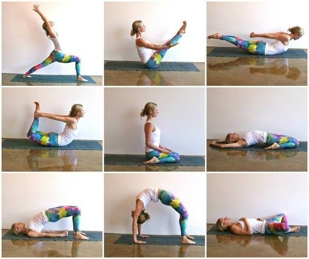 8. Урдхва Дханурасана. Поднимите бедра вверх, а затем положите руки рядом с ушами,чтобы пальцы смотрели на ноги. На вдохе, поднимите верхнюю часть головы. Выпрямите руки и поднимите голову от пола. Внешняя часть тела стремится вверх, а внутренняя поверхность бедер и спина вниз. Задержитесь на 5 вдохов и затем осторожно опуститесь.