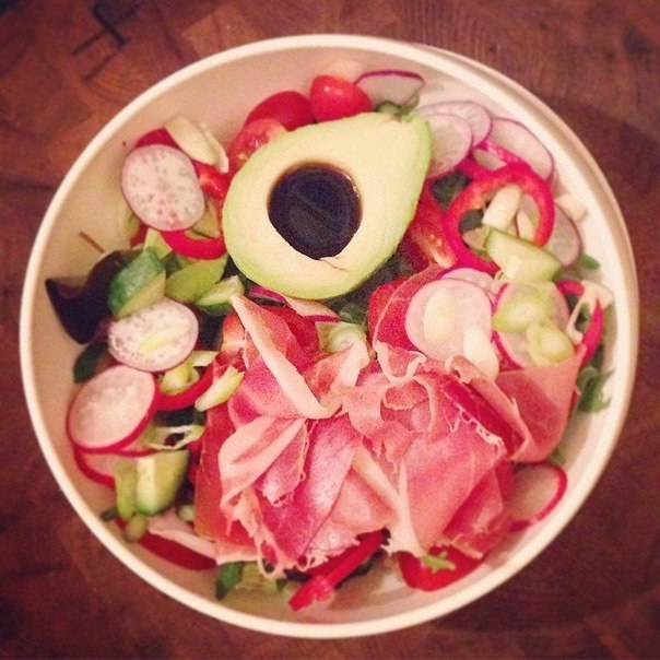3 ломтика ветчины, 1/2 авокадо, редис , помидоры черри, огурец, красный перец, микс салата, зеленый лук, бальзамический уксус.