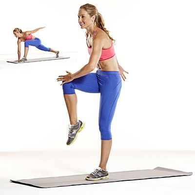 Примите позицию как для отжимания, ноги шире плеч, руки находятся на одном уровне с плечами. Сделайте шаг вперед левой ногой, чтобы получился выпад, правую руку оставьте на полу, а левую отведите назад. Оттолкнитесь обеими ногами и прыжком встаньте на левую ногу, а правое колено поднимите вверх, коснитесь его левой рукой. Вернитесь в выпад, затем в позицию для отжимания. Выполняйте 60 секунд, затем поменяйте стороны и повторите.