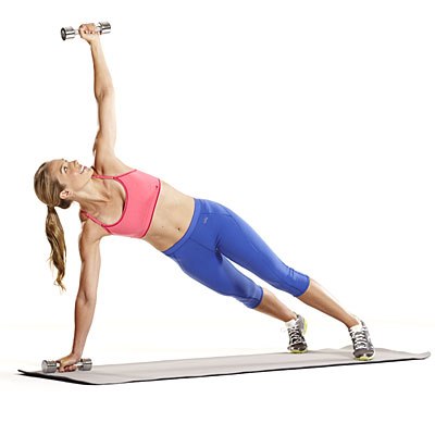 Примите позицию как для отжимания, ноги стоят шире плеч, в ладонях сожмите гантели и следите, чтобы руки были на одном уровне с плечами. Напрягите мышцы корпуса и одним движением, сохраняя руки прямыми, разверните корпус в левую сторону, при этом левую руку с гантелью вытяните вверх. Вернитесь в стартовую позицию и повторяйте 1 минуту, затем поменяйте стороны и повторите еще раз.