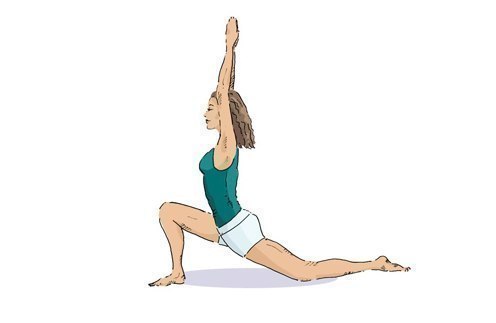 c) Разогнитесь и выпрямите туловище, поднимая руки над головой (см. картинку). Повторите упражнение, поменяв ноги.