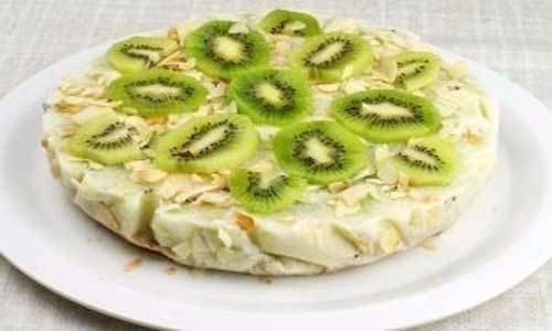 9. Спустя заданного времени, достаем торт «шедевр» из морозильной камеры, аккуратненько извлекаем его из формы и пергаментной бумаге, далее нам остается только включить свою богатую фантазию и как-то украсить его, я это сделал с лепестков миндаля и оставшегося киви.