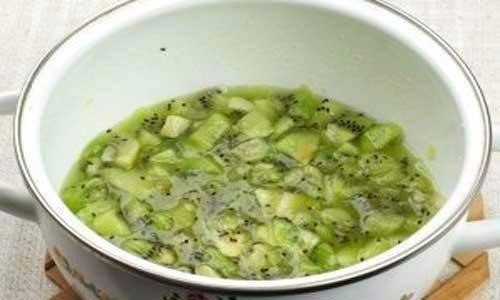 5. Далее займемся киви, его мы очистим от кожуры и нарежем на кубики, это сделаем с помощью ножа, поместим киви в небольшую кастрюльку, добавим к нему сахар и лимонный сок, после чего отправим кастрюльку на плиту чтобы киви немножко нагрелось и пустило собственный сок.