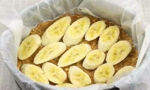 7. Пока мы проделывали высшее указанные действия уже достаточно хорошо застыл корж, его мы достаем из холодильника и выкладываем сверху на него резаный тонкими пластами банан, должно все выглядеть примерно, так как на фото ниже.